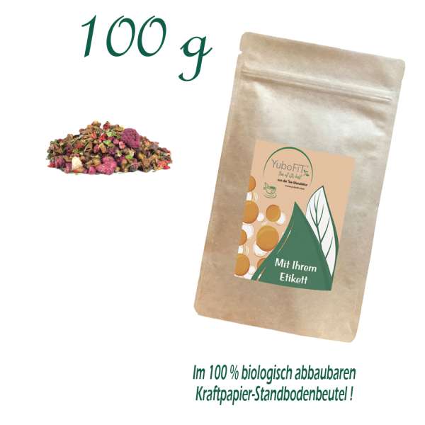 Appledream Moringa-Granatapfel-Himbeere Tee - Verpackung: Standbodenbeutel Big, Kraftpapier, aluminiumfrei, Inhalt 100 g