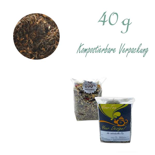 Assam FTGFOP1 2nd Flush Mokalbari Golden Tipped Tee - Verpackung: Kompostierbarer Zellglas-Beutel, Geprägtes Verschluss-Siegel aus Zuckerrohrpapier. Komplett abbaubar. Inhalt 40 g