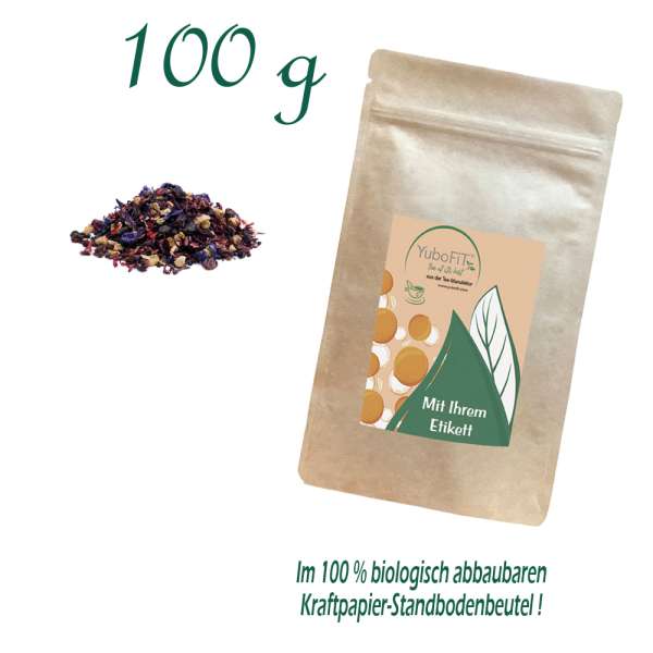 BIO Früchtetee Süße Blaubeere - Verpackung: Standbodenbeutel Big, Kraftpapier, aluminiumfrei, Inhalt 100 g