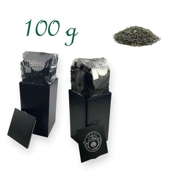 BIO Japan Sencha Tee - Verpackung: Quadratische Stülpdeckeldose, schwarz, Weißblech, Inhalt 100 g