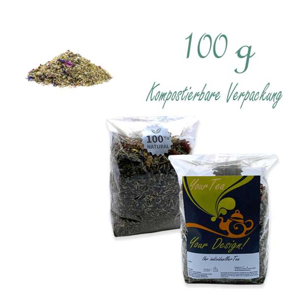 BIO Kräutertee FRENCH TOUCH - Verpackung: Kompostierbarer Zellglas-Beutel, Geprägtes Verschluss-Siegel aus Zuckerrohrpapier. Komplett abbaubar. Inhalt 100 g