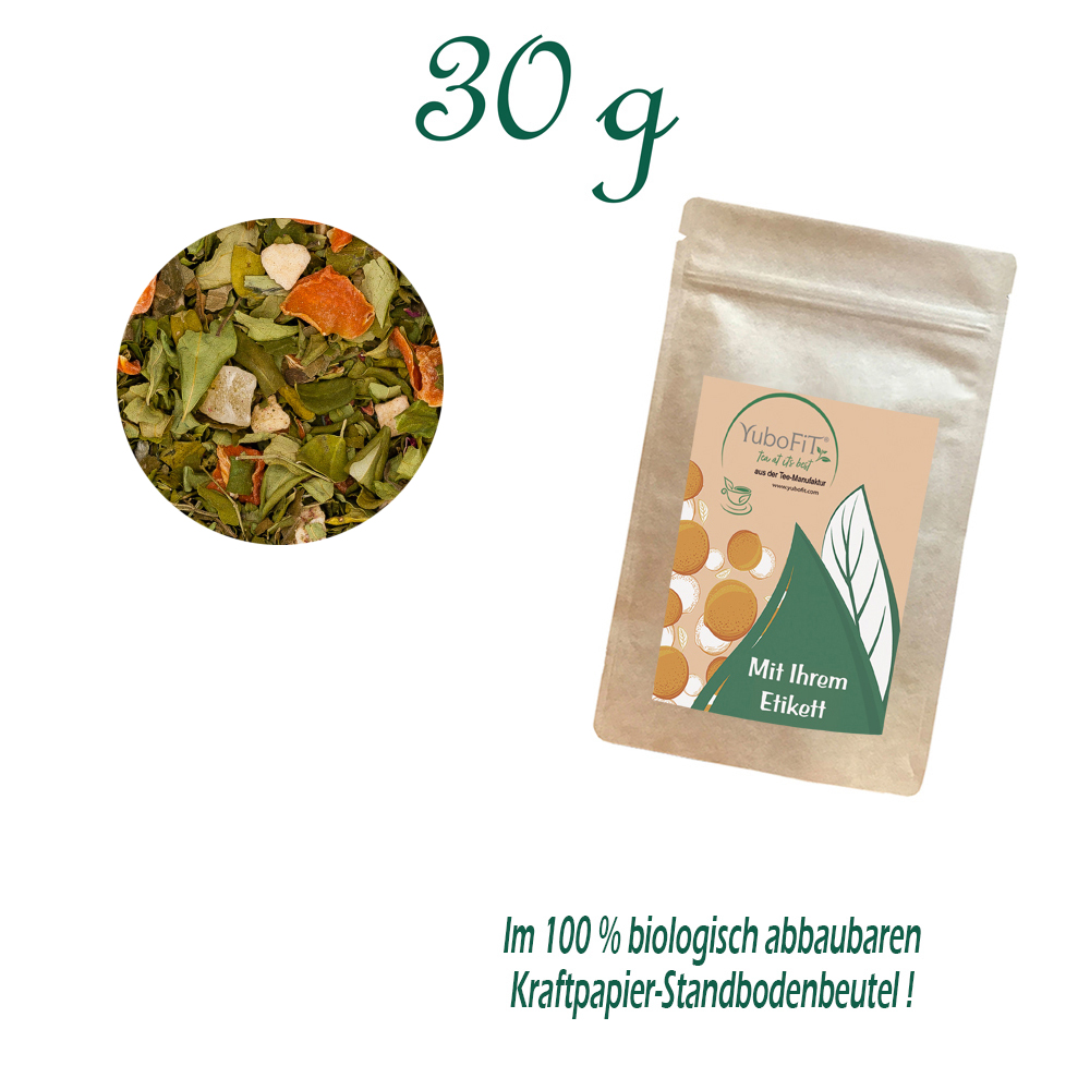 Bio Moringa Mango Tee - Verpackung: Standbodenbeutel Small, Kraftpapier, Inhalt 30 g