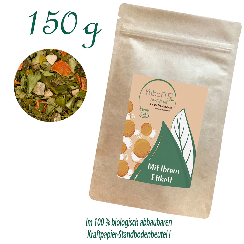 Bio Moringa Mango Tee - Verpackung: Standbodenbeutel Maxi, Kraftpapier, Inhalt 150 g