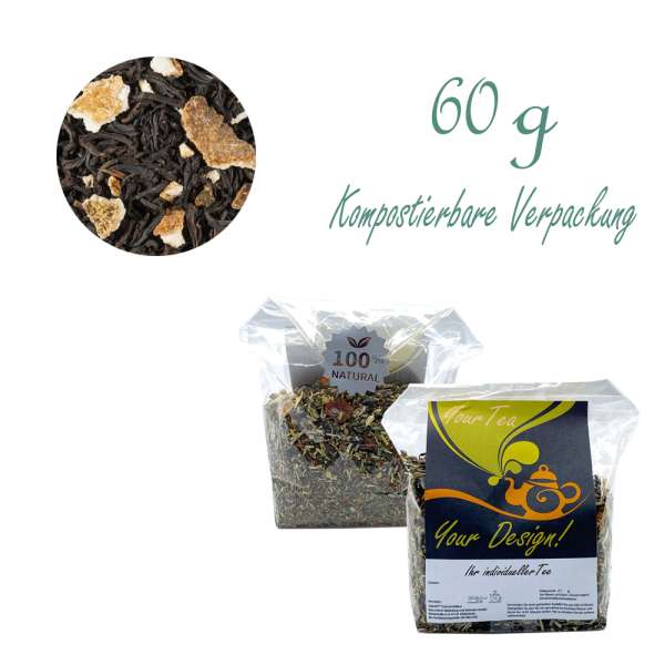 Bio Orange Tee - Verpackung: Kompostierbarer Zellglas-Beutel, Geprägtes Verschluss-Siegel aus Zuckerrohrpapier. Komplett abbaubar. Inhalt 60 g