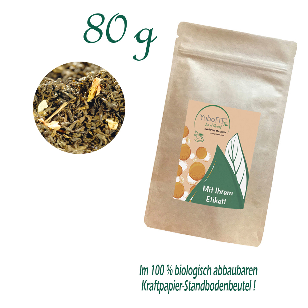 China Jasmin Tee mit extra vielen Blüten - Verpackung: Standbodenbeutel Medium Plus, Kraftpapier, aluminiumfrei, Inhalt 80 g