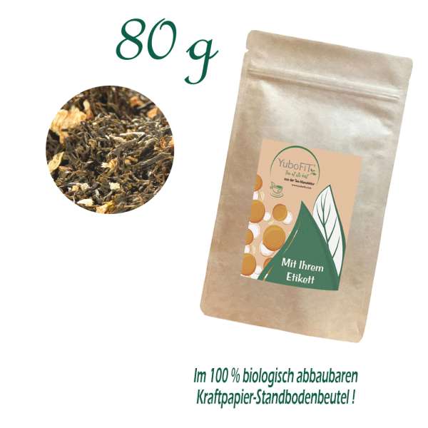 China Jasmintee mit Blüten - Verpackung: Standbodenbeutel Medium Plus, Kraftpapier, aluminiumfrei, Inhalt 80 g