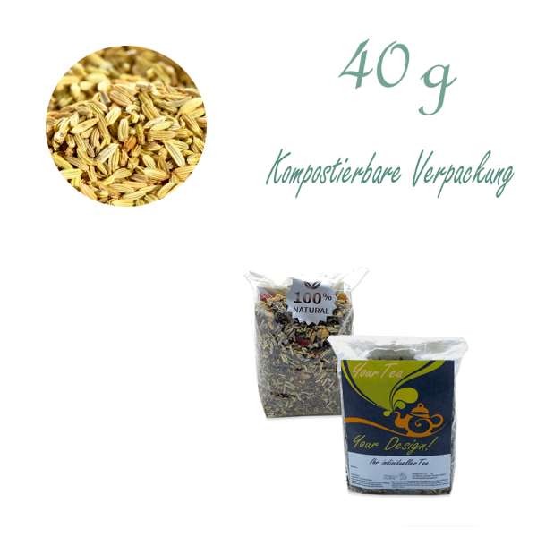 Fenchel Tee - Verpackung: Kompostierbarer Zellglas-Beutel, Geprägtes Verschluss-Siegel aus Zuckerrohrpapier. Komplett abbaubar. Inhalt 40 g