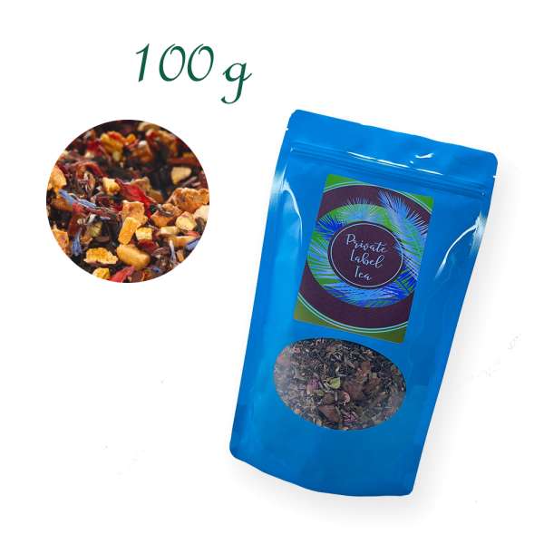 Früchtee CHRISTKINDLMARKT - Verpackung: Aluverbundfolien-Standbodenbeutel, Aromabeutel, blau, mit Fenster, Inhalt 100 g