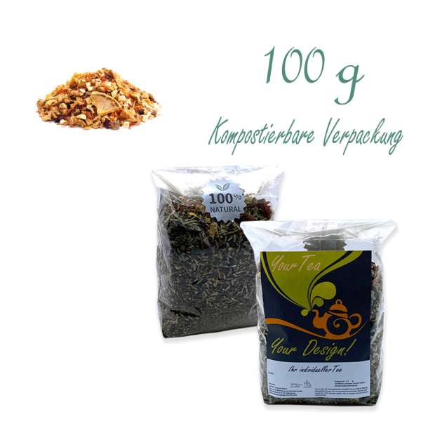 Früchtetee Apero Spritz - Verpackung: Kompostierbarer Zellglas-Beutel, Geprägtes Verschluss-Siegel aus Zuckerrohrpapier. Komplett abbaubar. Inhalt 100 g