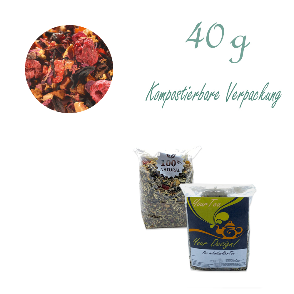 Früchtetee CHEER UP - Verpackung: Kompostierbarer Zellglas-Beutel, Geprägtes Verschluss-Siegel aus Zuckerrohrpapier. Komplett abbaubar. Inhalt 40 g