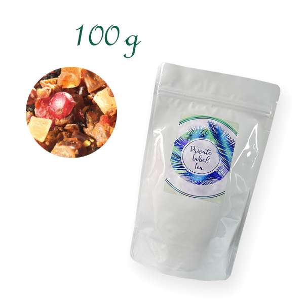 Früchtetee Dattelzauber Pitahaya-Cranberry - Verpackung: Aluverbundfolien-Standbodenbeutel, Aromabeutel, weiß, ohne Fenster, Inhalt 100 g