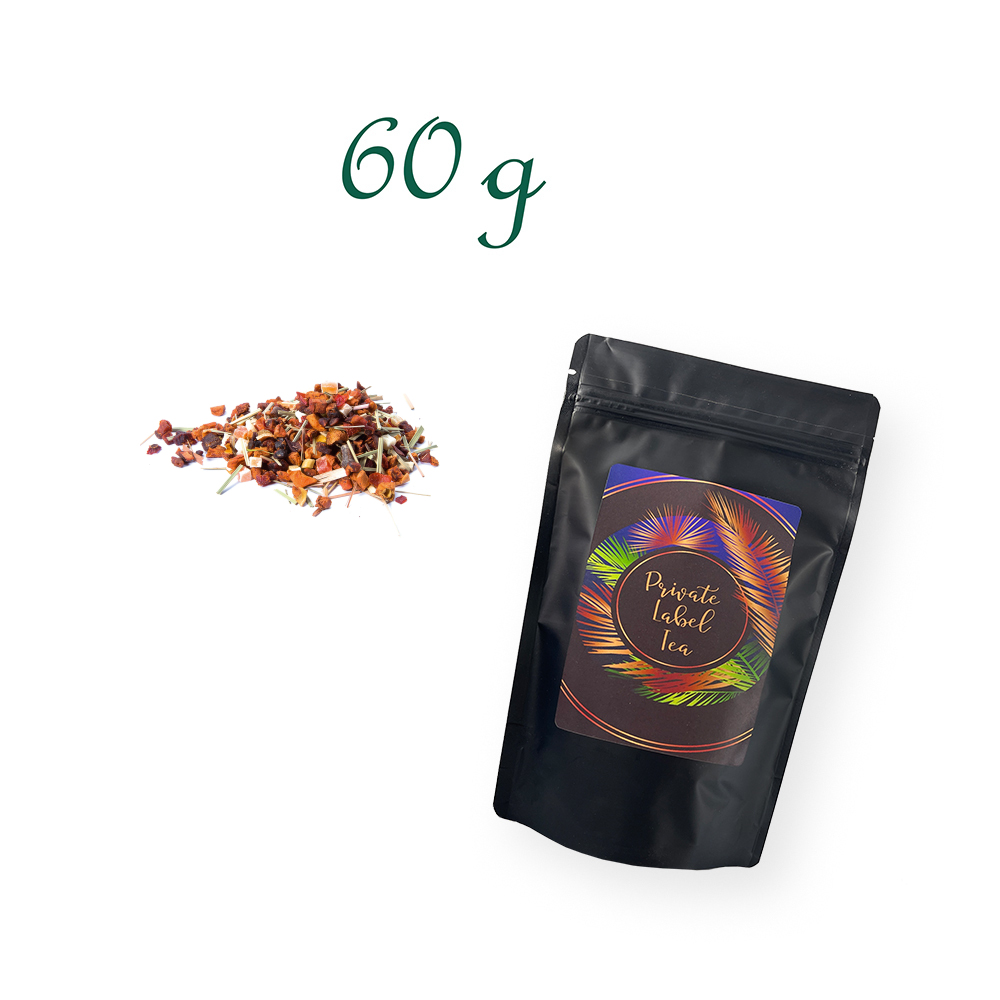 Früchtetee FALLIN' IN LOVE AGAIN - Verpackung: Standbodenbeutel, Aromabeutel, matt-schwarz, ohne Fenster, Inhalt 60 g
