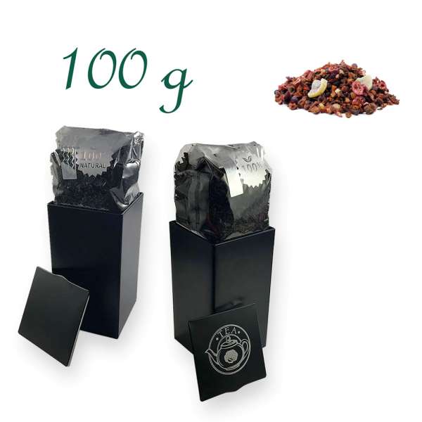 Früchtetee Goji-Himbeere - Verpackung: Quadratische Stülpdeckeldose, schwarz, Weißblech, Inhalt 100 g