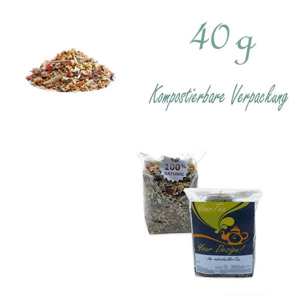 Früchtetee Grapefruit-Aloe Vera - Verpackung: Kompostierbarer Zellglas-Beutel, Geprägtes Verschluss-Siegel aus Zuckerrohrpapier. Komplett abbaubar. Inhalt 40 g