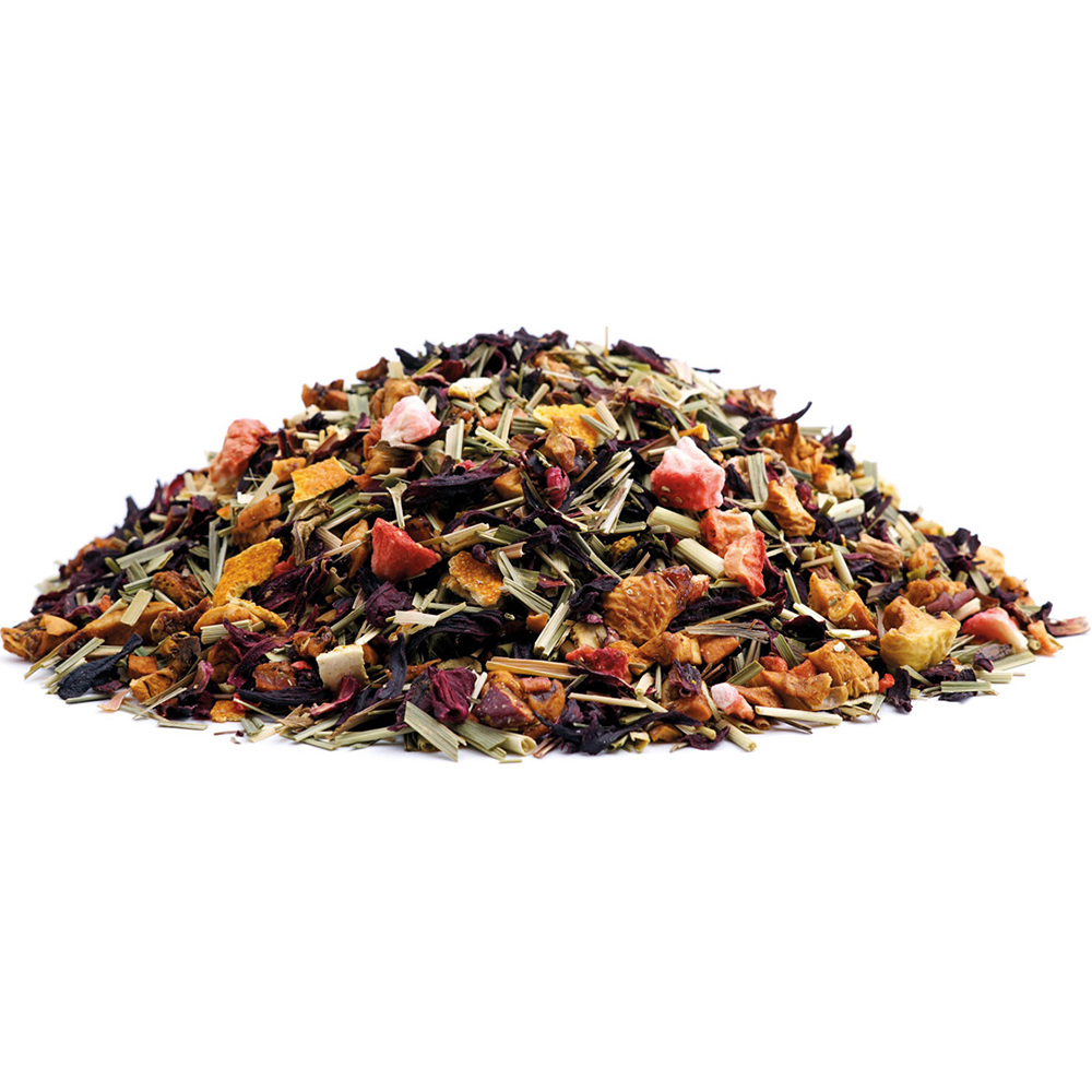 Hibiskusblüten (41%), Zitronengras, Orangenecken (20%), Erdbeerstücke (3%), natürliches Orangen-Aroma, Aroma, natürliches Aroma, Äpfel, Säuerungsmittel: Weinsäure.