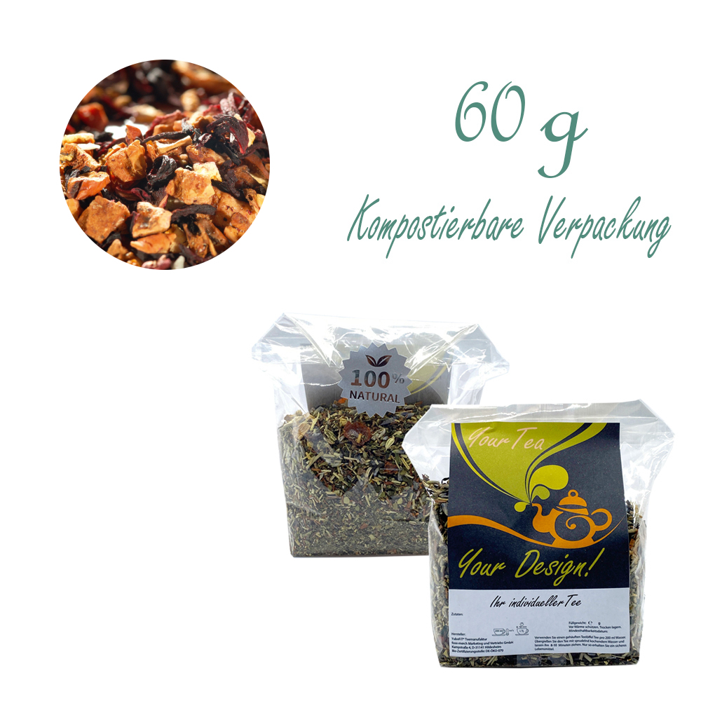 Früchtetee PINA COLADA - Verpackung: Kompostierbarer Zellglas-Beutel, Geprägtes Verschluss-Siegel aus Zuckerrohrpapier. Komplett abbaubar. Inhalt 60 g