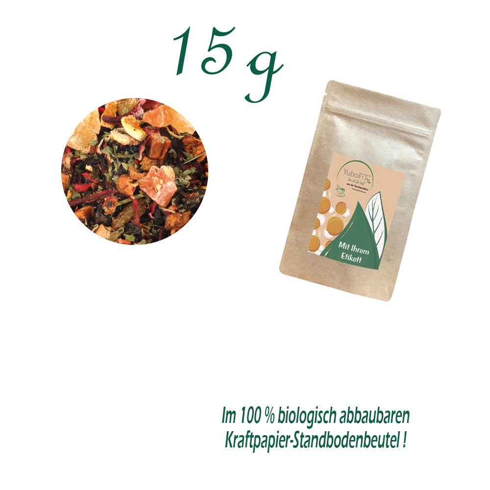 Früchtetee SECRET LOVE AFFAIR - Verpackung: Standbodenbeutel Mini, Kraftpapier, Inhalt 15 g