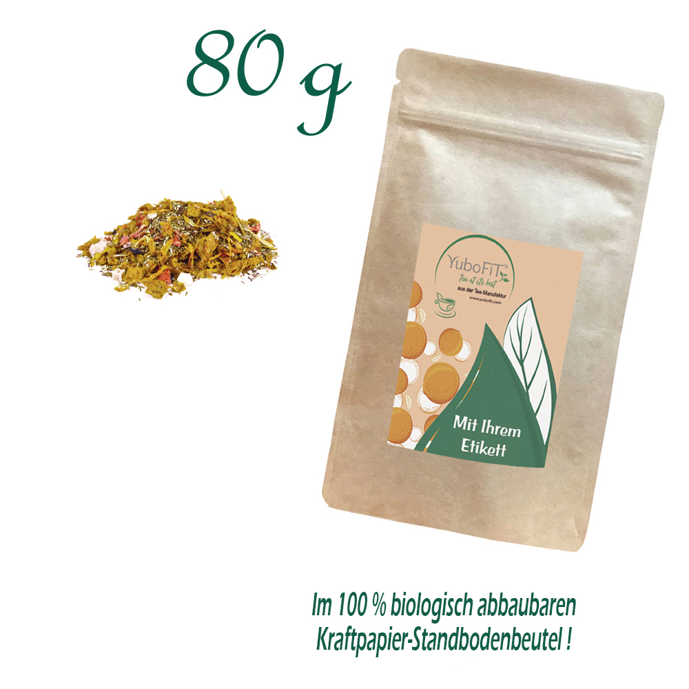 Grüner Rotbuschtee TEMPLE Of MONEY - Verpackung: Standbodenbeutel Medium Plus, Kraftpapier, aluminiumfrei, Inhalt 80 g