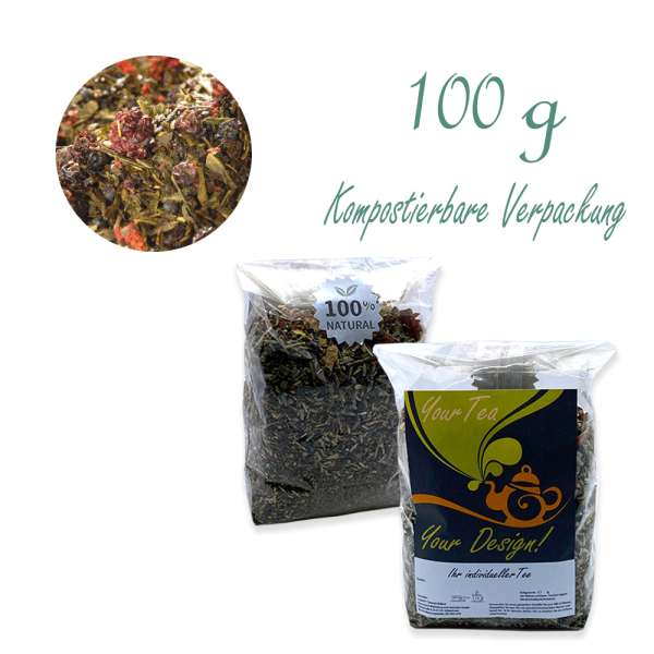 Grüner Tee (52%), Korinthen, Schwarze Johannisbeeren, Aroma, Holunderbeeren (Sambucus ebulus L.), Brombeeren, Himbeerstücke, Erdbeerstücke.