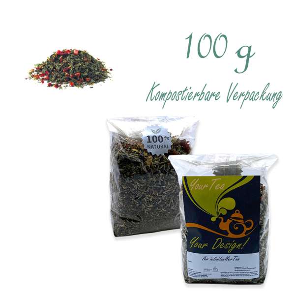 Grüner Tee (75%), Kurkuma (8%), Gojibeeren, Aroma, Rosenblütenblätter, Sauerkirschen (2%), Erdbeerstücke.