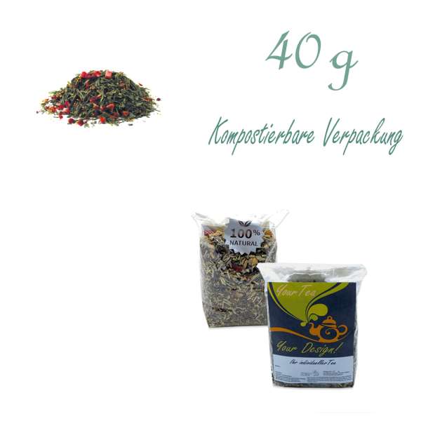 Grüner Tee (75%), Kurkuma (8%), Gojibeeren, Aroma, Rosenblütenblätter, Sauerkirschen (2%), Erdbeerstücke.