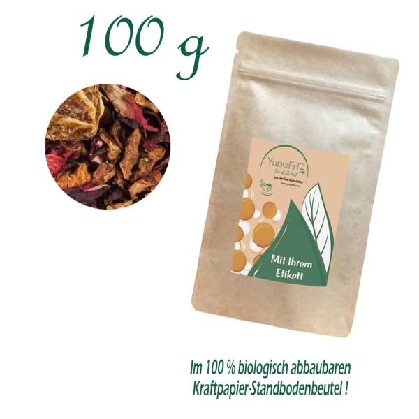 Hibiskusblüten, Hagebuttenschalen, Apfelstücke, Rooibos, Mandelstücke, Orangenfruchtspalten mit Schale, Zimt, Aromen, Vanillestücke