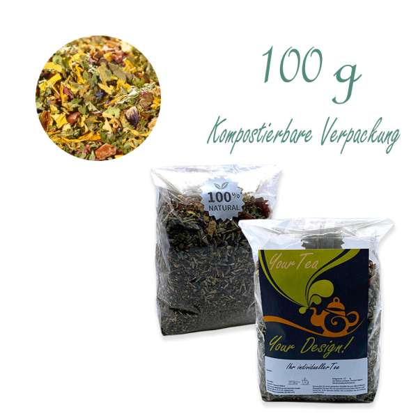 Kräutertee FLOWER HOP - Verpackung: Kompostierbarer Zellglas-Beutel, Geprägtes Verschluss-Siegel aus Zuckerrohrpapier. Komplett abbaubar. Inhalt 100 g