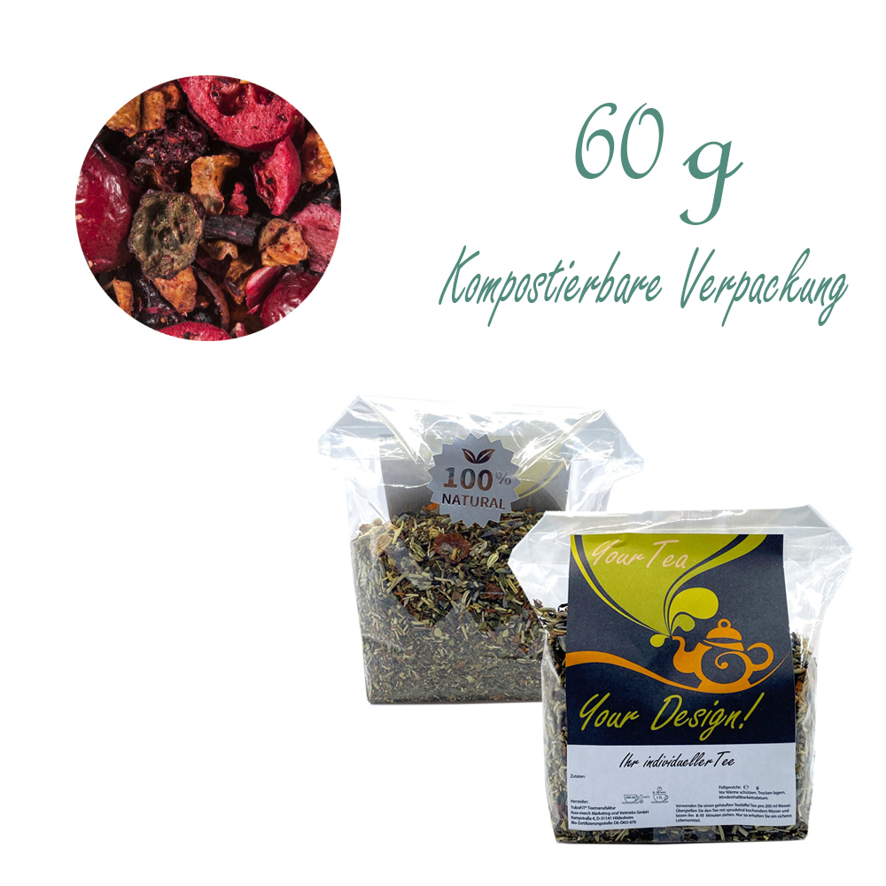 Obstvergnügen Tee - Verpackung: Kompostierbarer Zellglas-Beutel, Geprägtes Verschluss-Siegel aus Zuckerrohrpapier. Komplett abbaubar. Inhalt 60 g