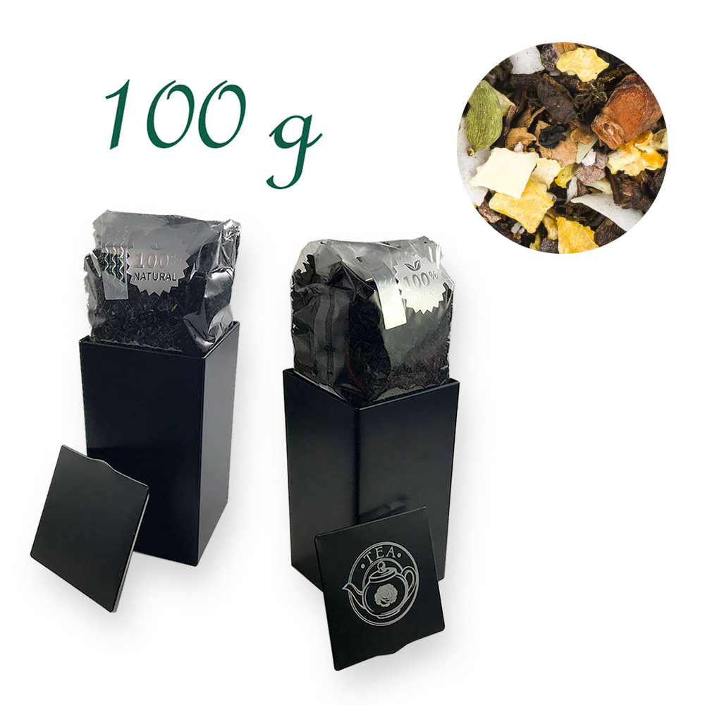 Oolong Kürbis Chai Tee - Verpackung: Quadratische Stülpdeckeldose, schwarz, Weißblech, Inhalt 100 g