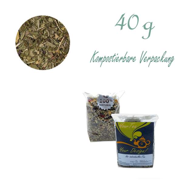 Pfefferminze, geschnitten Tee - Verpackung: Kompostierbarer Zellglas-Beutel, Geprägtes Verschluss-Siegel aus Zuckerrohrpapier. Komplett abbaubar. Inhalt 40 g