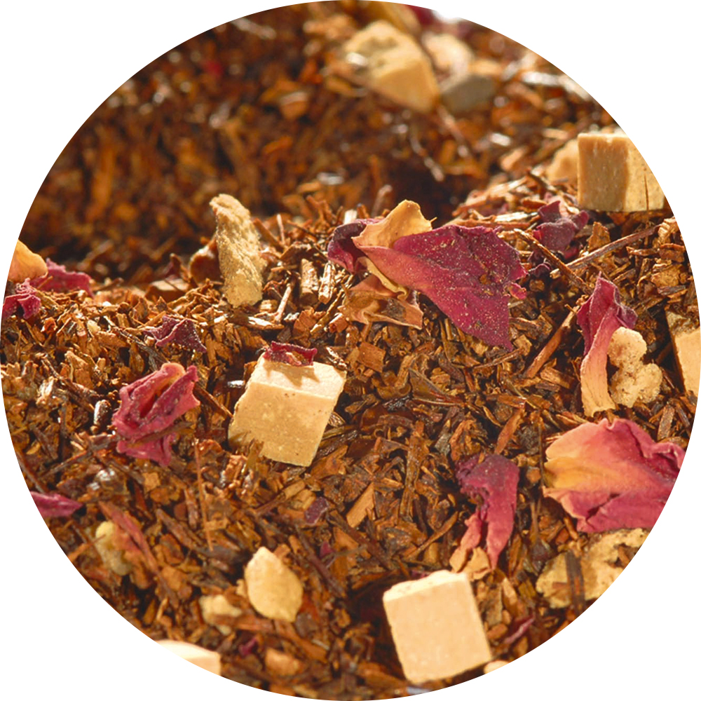 Rotbuschtee (76%), Karamellstücke (8%) (MAGERKONDENSMILCH, Zucker, Glukosesirup, BUTTERFETT, Feuchthaltemittel: Sorbitsirup, Emulgator: Mono- und Diglyceride von Speisefettsäuren), HASELNUSSKROKANT (Zucker, HASELNÜSSE), Aroma, Orangenschalen (2%), Rosenblütenblätter, Zimtstücke (2%), Gewürznelken, Kardamompulver.