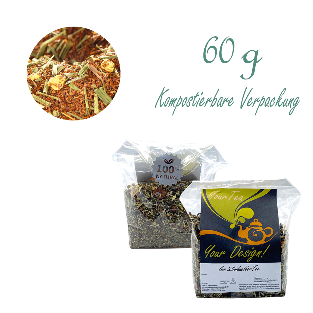 Rotbuschtee (89%), Zitronengras, natürliches Orangen-Aroma, Orangengranulat (2%) (Orangensaftkonzentrat, Orangenzellen), natürliches Aroma, natürliches Bergamotte-Aroma mit anderen natürlichen Aromen.