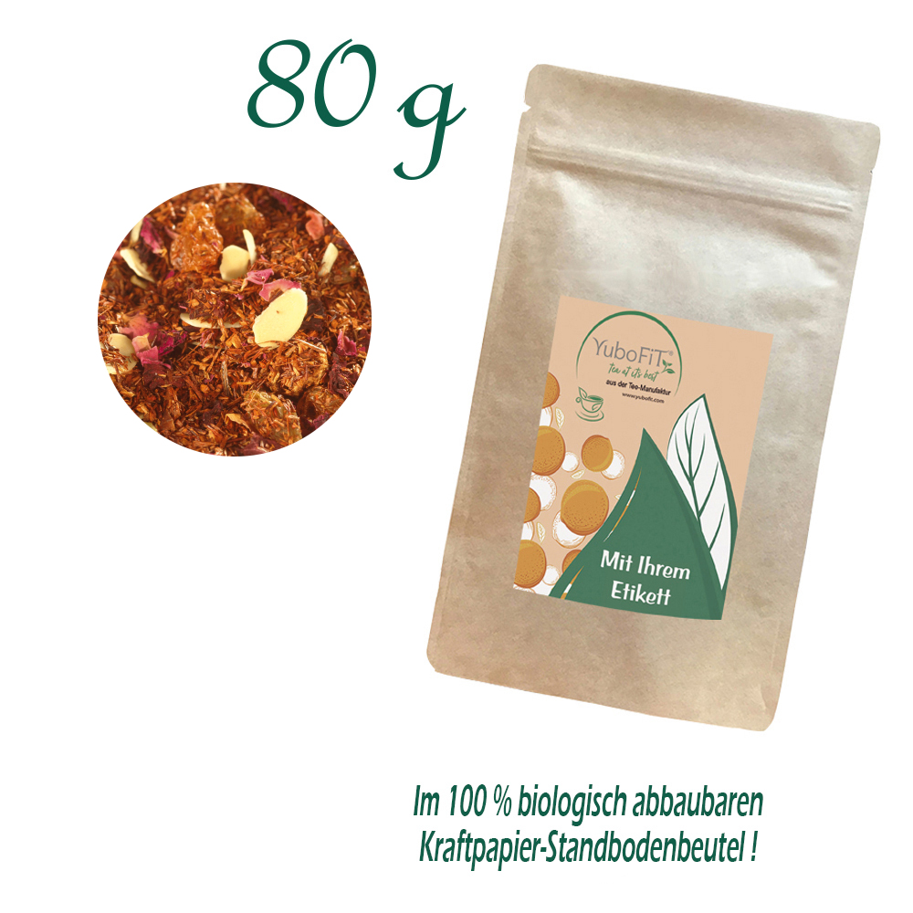 Rotbuschtee SWEET WINTER ALMOND - Verpackung: Standbodenbeutel Medium Plus, Kraftpapier, aluminiumfrei, Inhalt 80 g