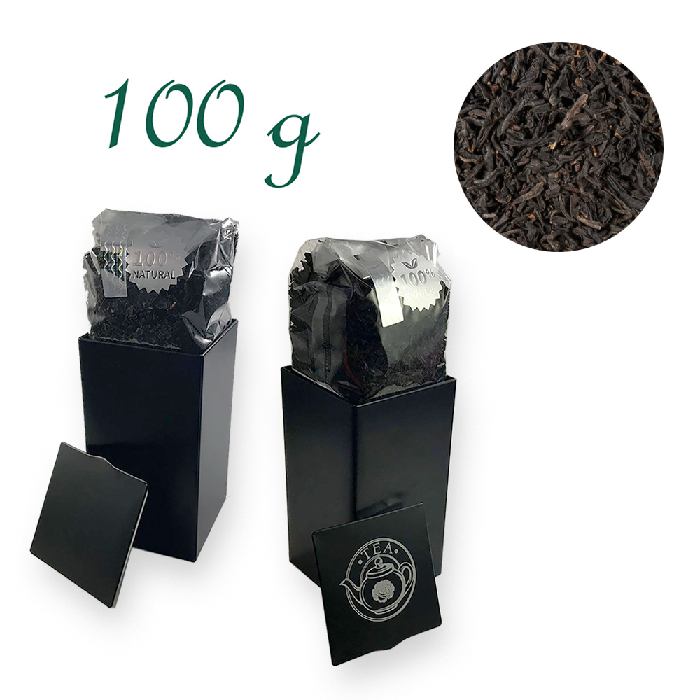 Russische Mischung Tee - Verpackung: Quadratische Stülpdeckeldose, schwarz, Weißblech, Inhalt 100 g
