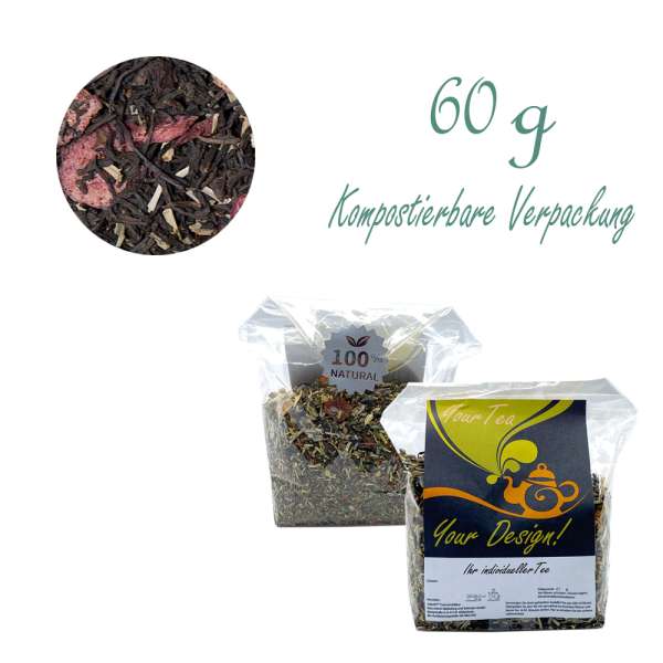 Sanddorn-Cranberry Tee - Verpackung: Kompostierbarer Zellglas-Beutel, Geprägtes Verschluss-Siegel aus Zuckerrohrpapier. Komplett abbaubar. Inhalt 60 g