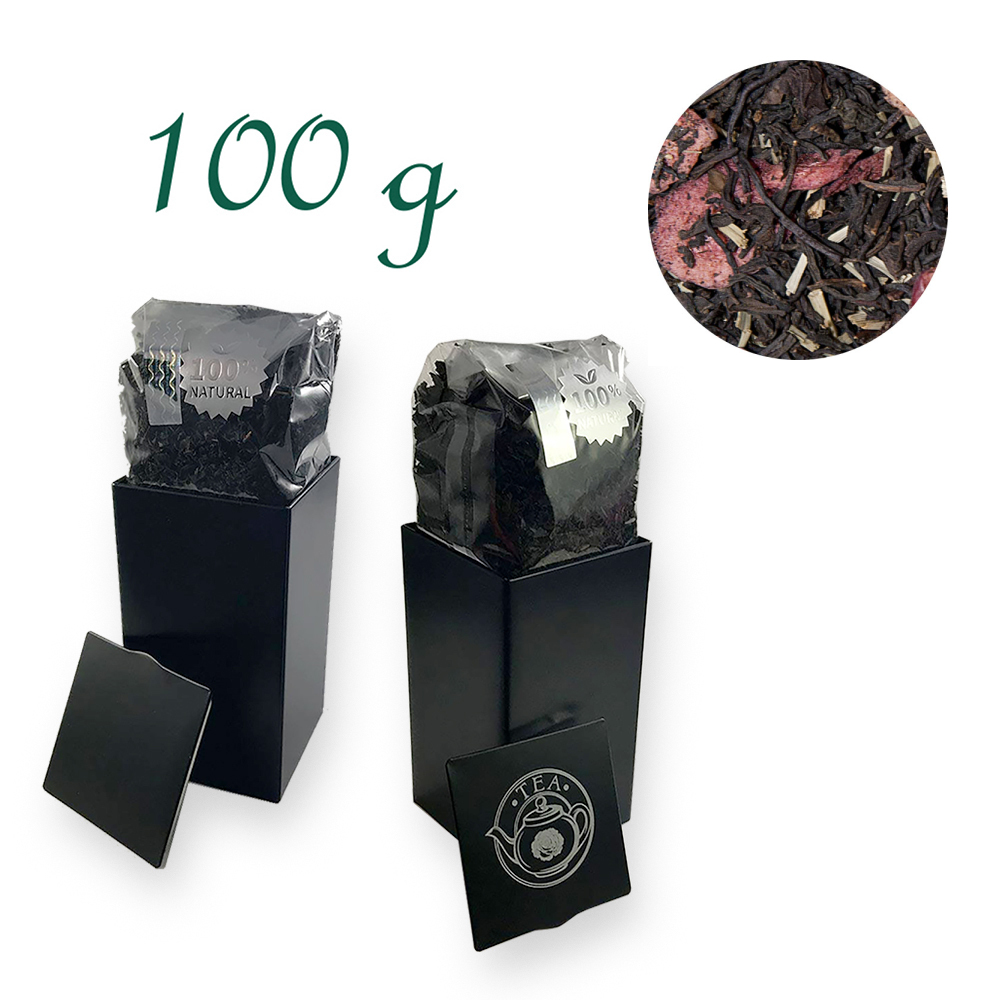 Sanddorn-Cranberry Tee - Verpackung: Quadratische Stülpdeckeldose, schwarz, Weißblech, Inhalt 100 g