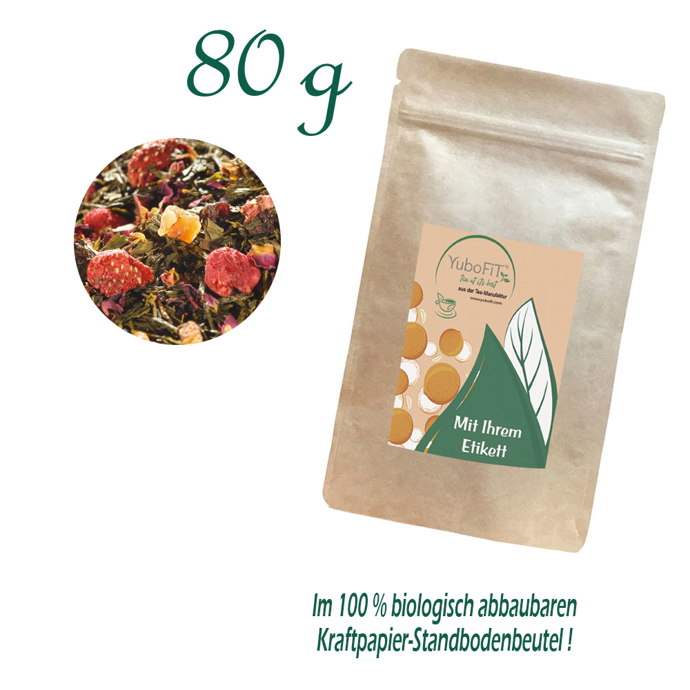 Grüner Tee (72%), Korinthen, Aroma, Rosenblütenblätter, Ananasstücke (Ananas, Zucker, Säuerungsmittel: Zitronensäure), Papayastücke (Papaya, Zucker), Erdbeerstücke, Himbeerstücke (2%), natürliches Aroma.