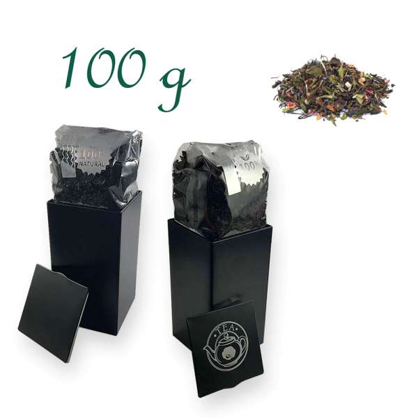 Weißer Tee LIEBESGRÜßE AUS MOSKAU - Verpackung: Quadratische Stülpdeckeldose, schwarz, Weißblech, Inhalt 100 g